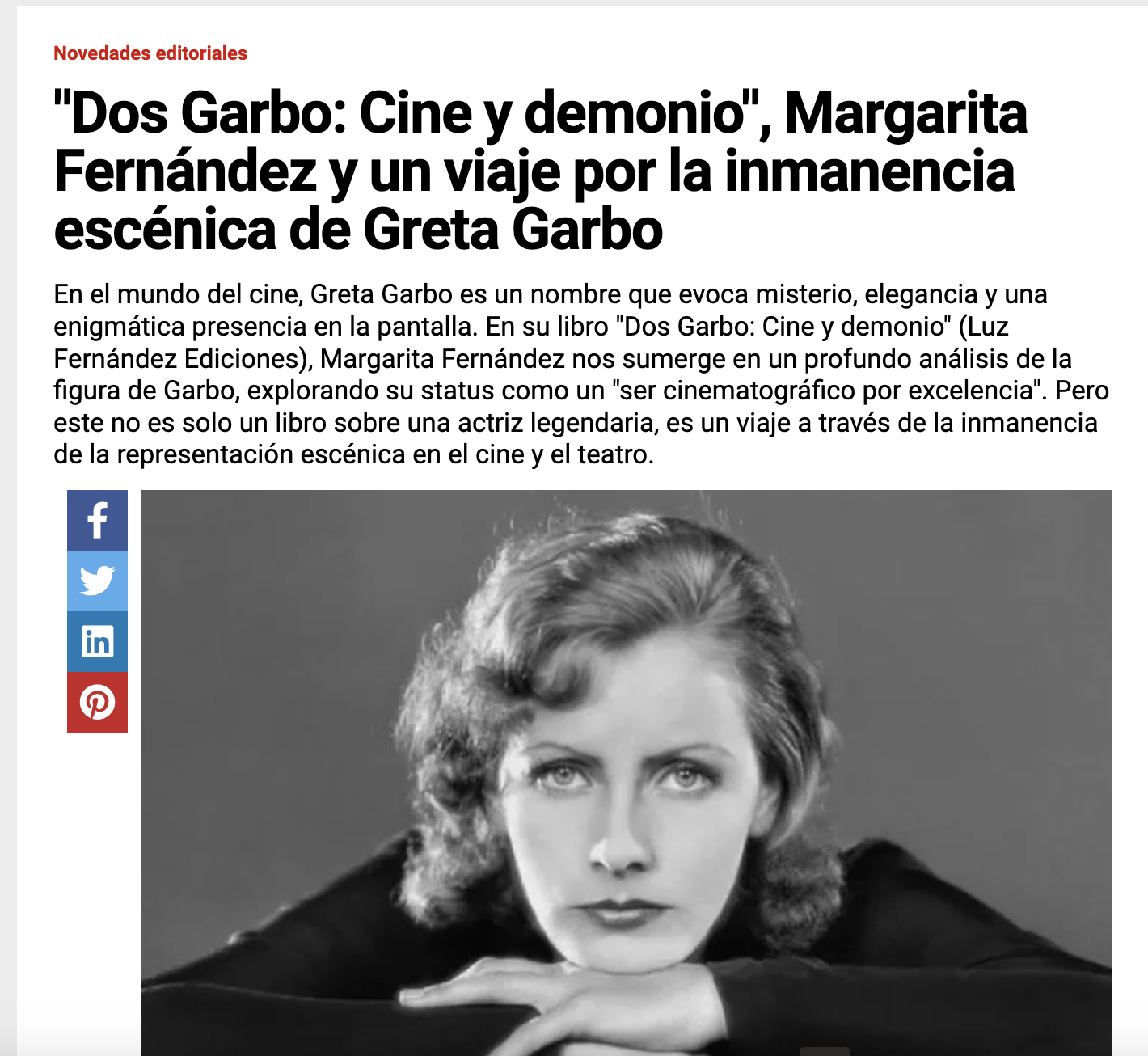 Nota en escribiendocine.com de Dos Garbo Publicación de la entrada:7 diciembre, 2023 Categoría de la entrada:Prensa Muchas gracias escribiendo cine.com por la nota del libro Dos Garbo: Cine y demonio. Pueden leerla online en el siguiente link: https://www.escribiendocine.com/noticias/2023/10/20/16512-dos-garbo-cine-y-demonio-margarita-fernandez-y-un-viaje-por-la-inmanencia-escenica-de-greta-garbo También podría gustarte Entrevista en AM 1270 5 octubre, 2023 “¿Por qué leer a los griegos?” en La Nación 7 agosto, 2025 Fernando Martín Peña repasa la historia del cine argentino en EscribiendoCine 2 febrero, 2025